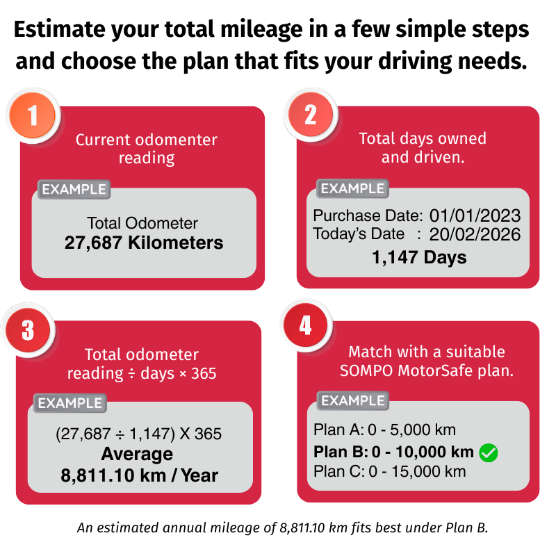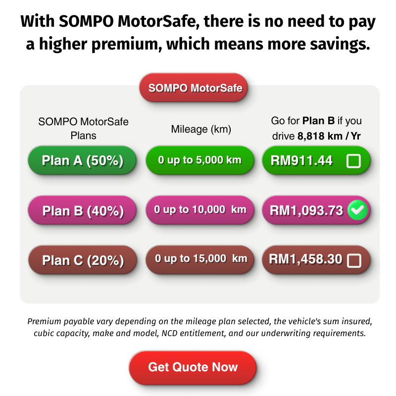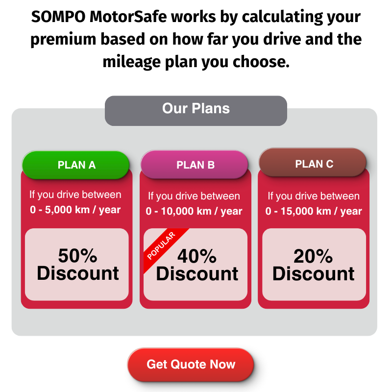 Introducing SOMPO MotorSafe, our mileage-based car insurance solution designed for Malaysians who drive less. If you're looking for more affordable car insurance in Malaysia without compromising on protection, SOMPO MotorSafe is made for you.