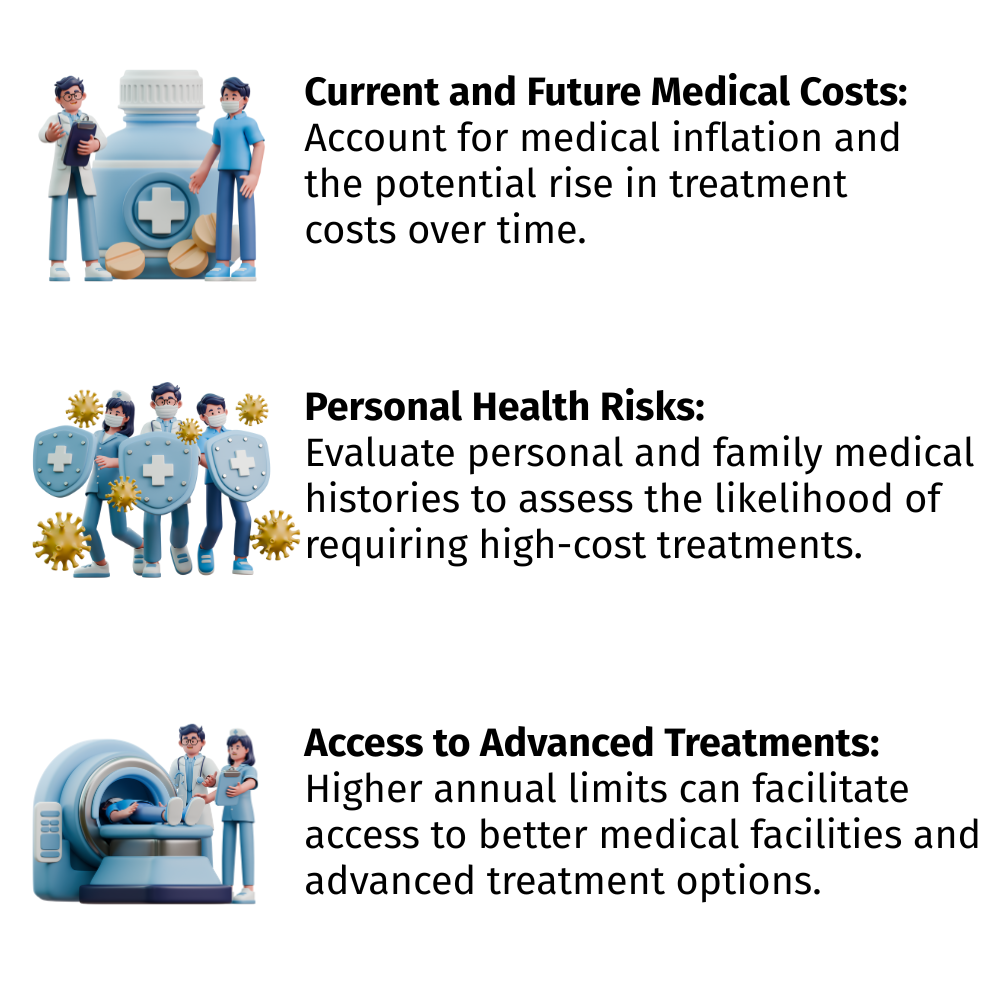 Medical inflation, the rate at which medical costs increase over time. This significantly affects the adequacy of insurance coverage. Factors contributing to medical inflation include currency fluctuations, higher demand for healthcare services, and an aging population. As medical costs rise, treatments and services become more expensive, potentially outpacing the coverage provided by insurance policies with lower annual limits.