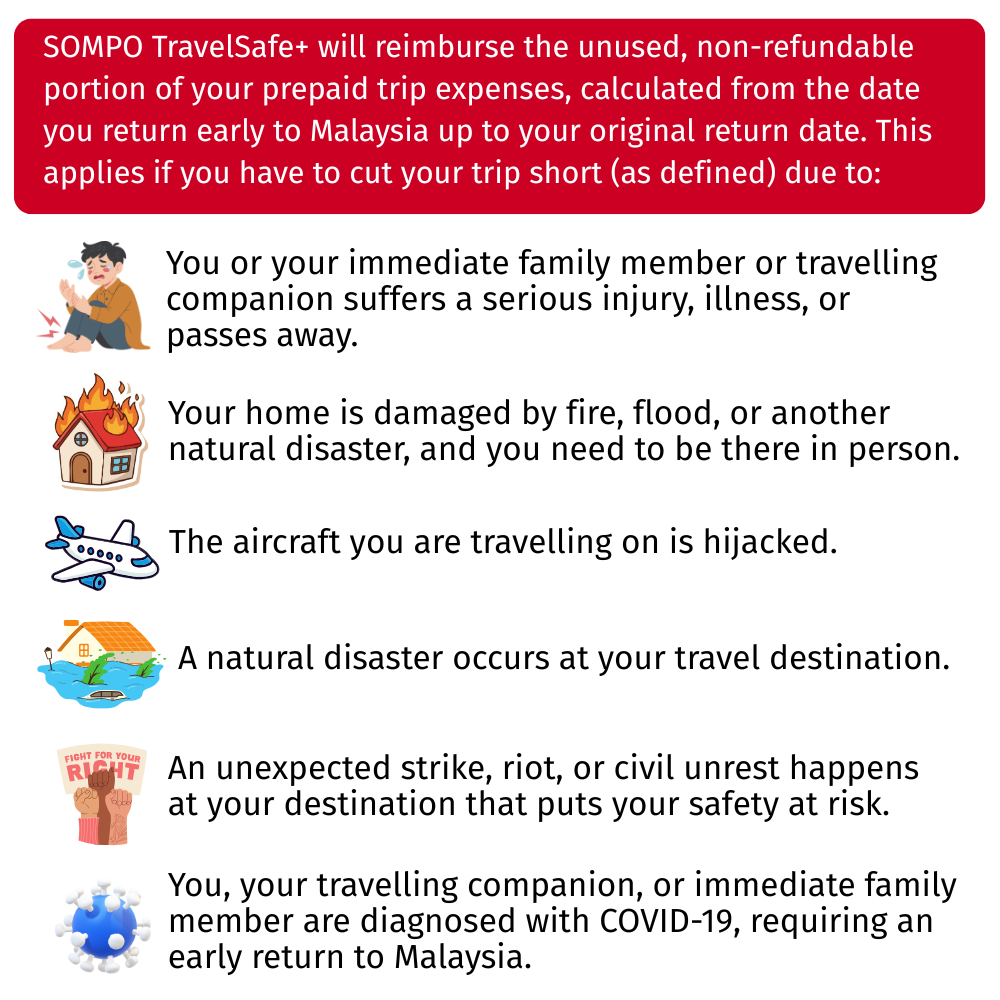Fortunately, I had purchased SOMPO TravelSafe+ before my trip. When I returned home safely, I contacted Berjaya Sompo Insurance, and their claims team provided clear guidance throughout the process. Since the trip curtailment was due to a natural disaster affecting my residence, my policy covered both the unused travel expenses and the cost of my early return.