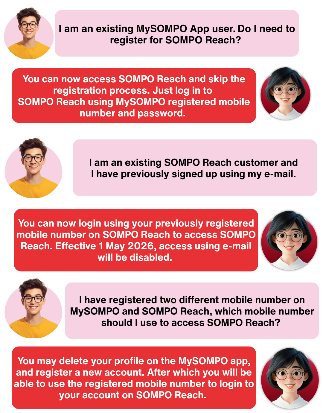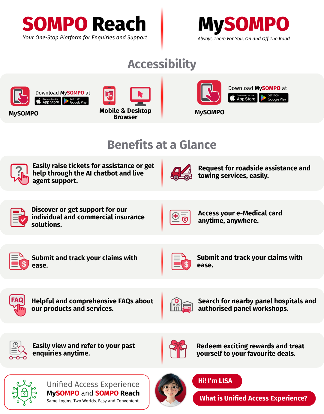 Home Unified Access Experience Unified Access Experience Now, one login gives you access to both MySOMPO and SOMPO Reach. For greater convenience and faster assistance.
