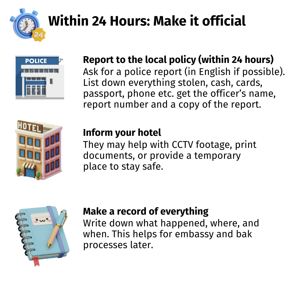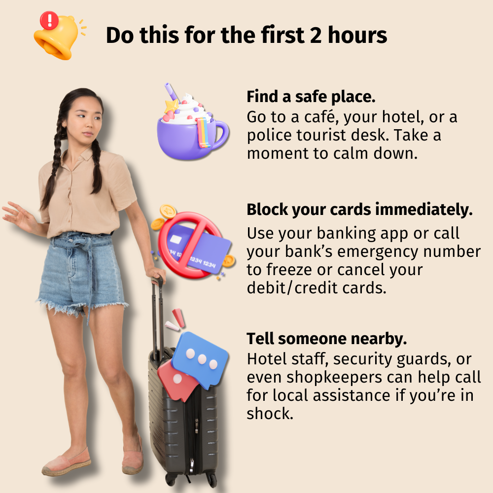 Inside that wallet? RM5,000 in cash, my cards, and my ID. Gone in seconds. I felt my stomach drop. The panic hit me hard, stranded in a foreign city, without money or identification, not knowing who to call first or what to do next. So, what to do if you encounter something like this while travelling:
