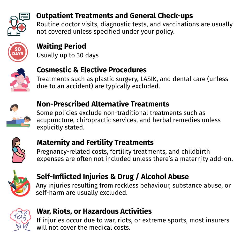 Not knowing what is covered and what is excluded can lead to unexpected medical expenses and financial strain. More importantly, every time you make a claim, it impacts your annual limit. If you exhaust your limit on unnecessary claims, you may not have sufficient coverage left when you truly need it for a serious medical condition.